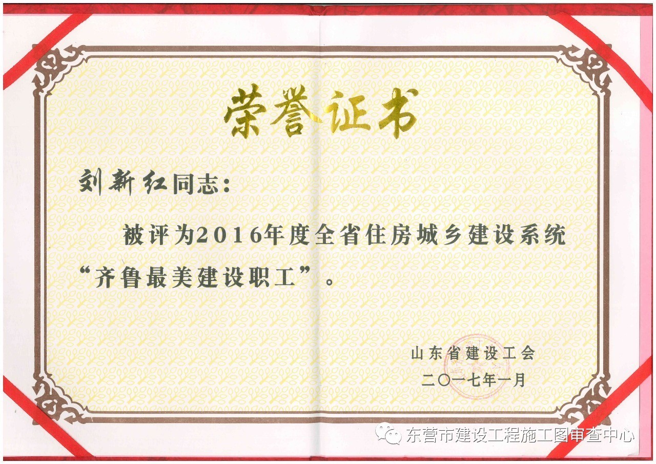 齐鲁最美,兢兢业业,谱建设者赞歌。在东营市审图中心,你总能见到一位温文尔雅,一丝不苟的老工程师,他就是中心技术负责人-刘新红同志。刘新红同志自参加工作以来始终坚持人无我有、人有我精的工作态度,在自己的岗位上兢兢业业、无私奉献,先后获得中心“突出贡献奖”、市“十佳杰出工程师”以及省“齐鲁最美建设职工”等荣誉称号。在无数荣誉面前他始终不忘初心,严谨认真而不执拗,和蔼可亲而不失威严,他宛若一面具有感染力和生命力的旗帜,为中心全体员工树立模范带头作用,我们以刘新红同志为榜样,用我们的实际行动谱写建设者的赞歌。